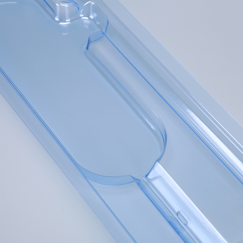 Särskilt medicinskt material PETG, hård textur, god seghet, hög styrka, ljus yta, jämn och genomskinlig färg, bakgrundsfärgen är blå och vit, kan pressas med hög frekvens och kan steriliseras